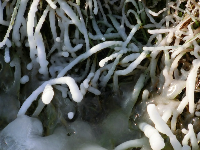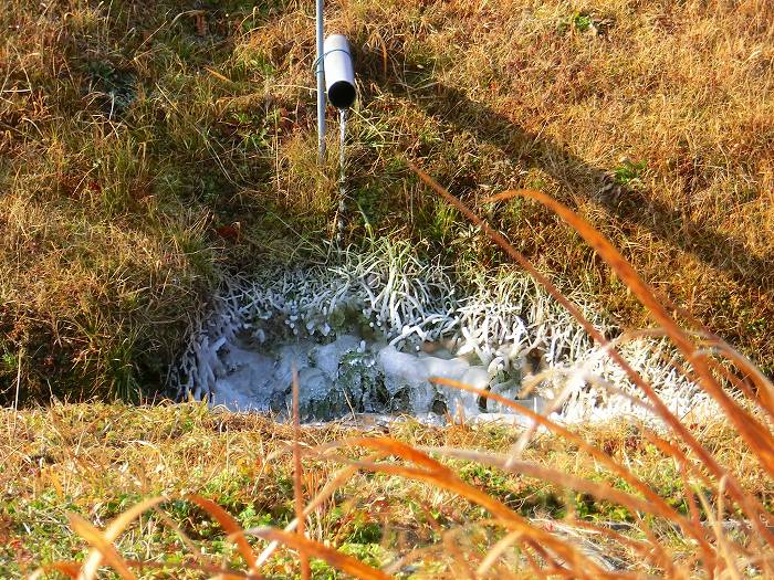 田んぼのゲシの塩ビ管から出る水が氷になっている。