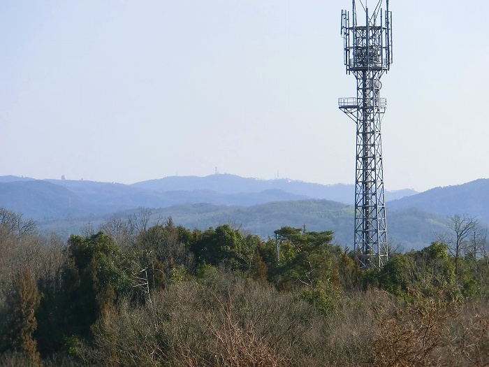 ドコモのアンテナ、向うに小さく竹林寺山の天体ドームが見える。