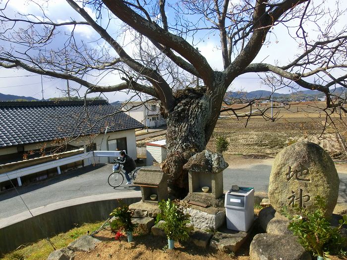 木の根元には「地神」と、他に二つの祠が並んでいる。