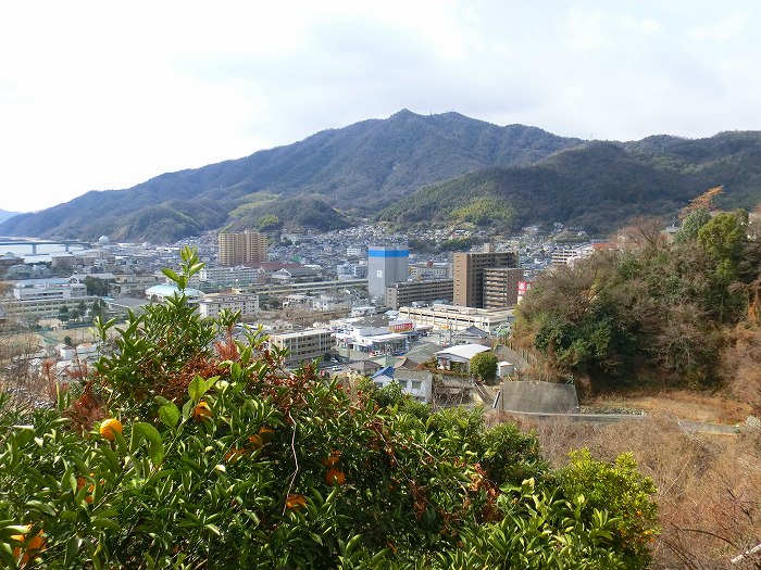 阿賀の町、背後の休山。