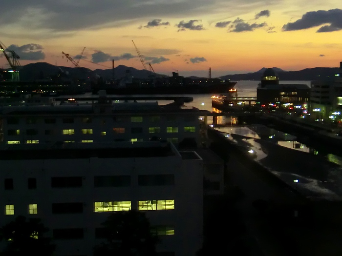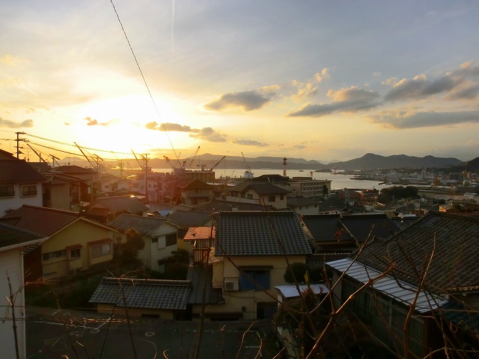 その頃、夕日が街と海を照らした。江田島に沈む夕日。