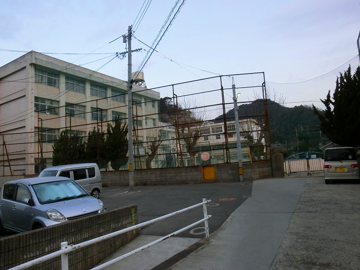 唯一、ひろびろとした両城中学校。学校を中心にして、これまた唯一の車道が通っている。