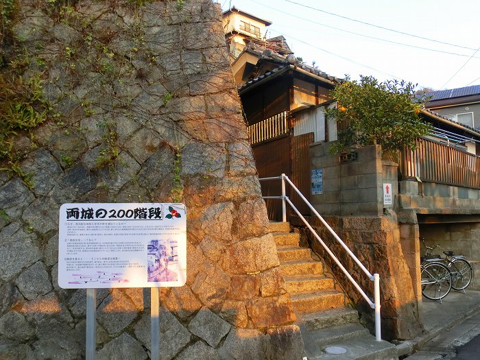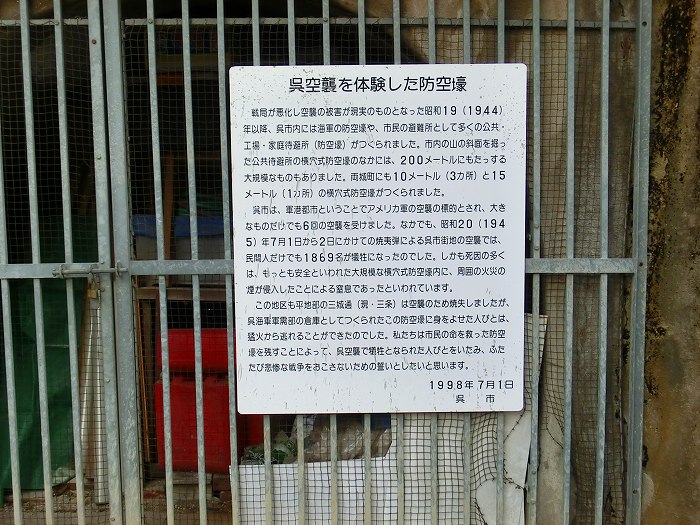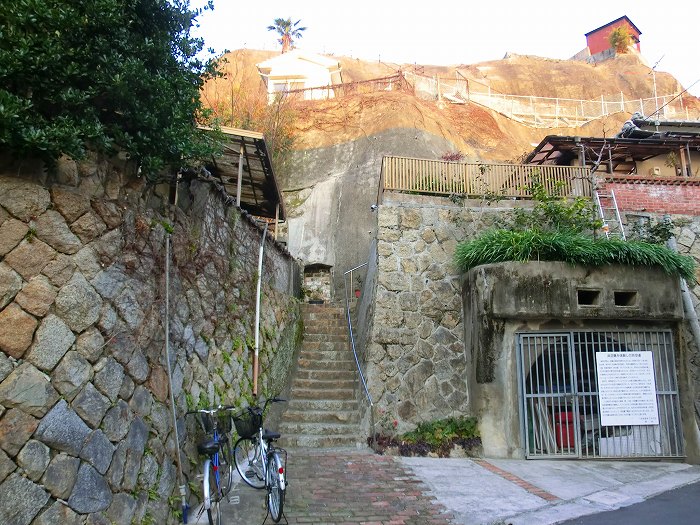 学校の裏が200階段のはじまりで、その横には防空壕が残っている。