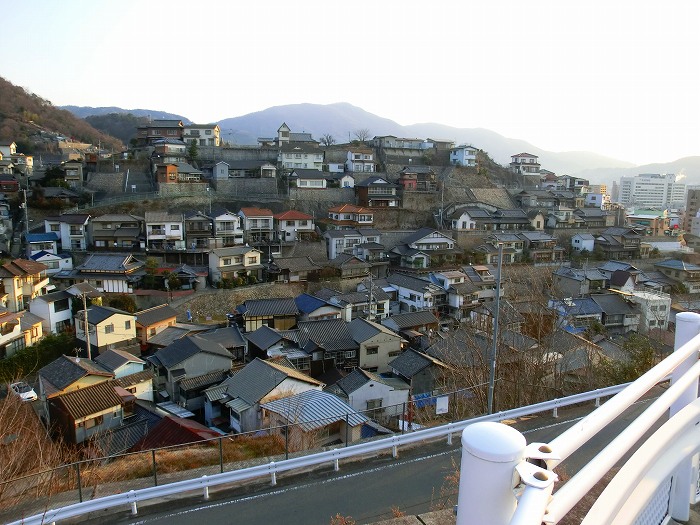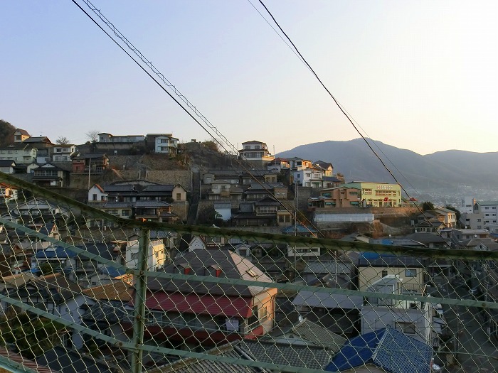 金網の下は絶壁だが、そのぶん景色がいい。向う側の住宅が迫るように見える。
