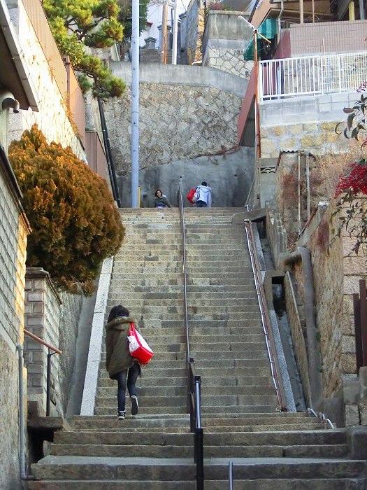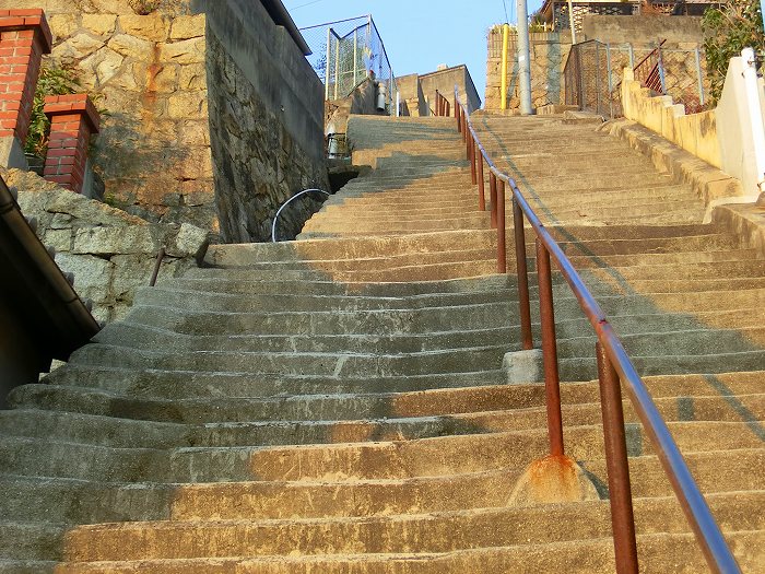 住宅と階段が何本も見える。ほとんどの住宅は車道まで遠い。