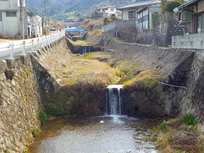坂の町へ流れる川、小屋浦と似て石組みの砂防ダムがつづいている。
