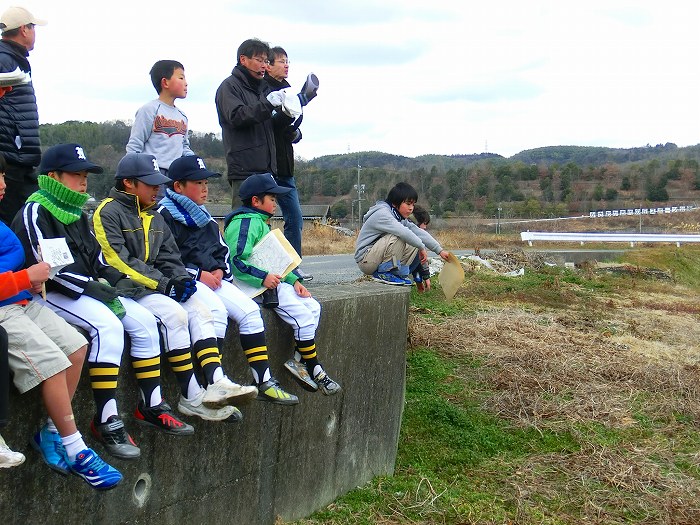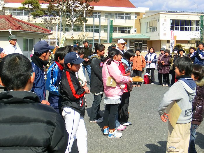 尾坂川の発表会をねぎらわれる新山小5年の生徒。