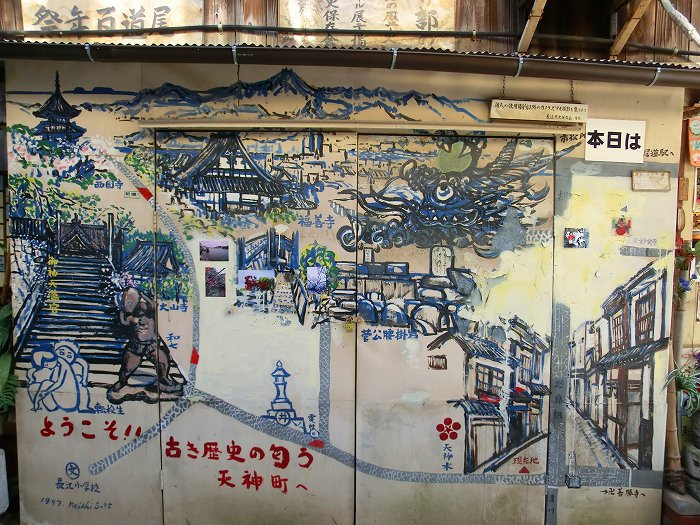 県道を渡ると、石畳の道に「ようこそ!! 古き歴史の匂う 天神町へ」の壁画が迎えてくれる。