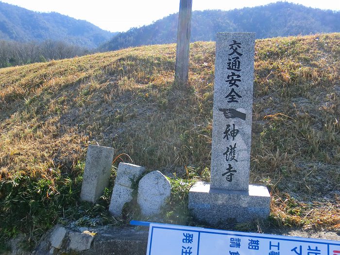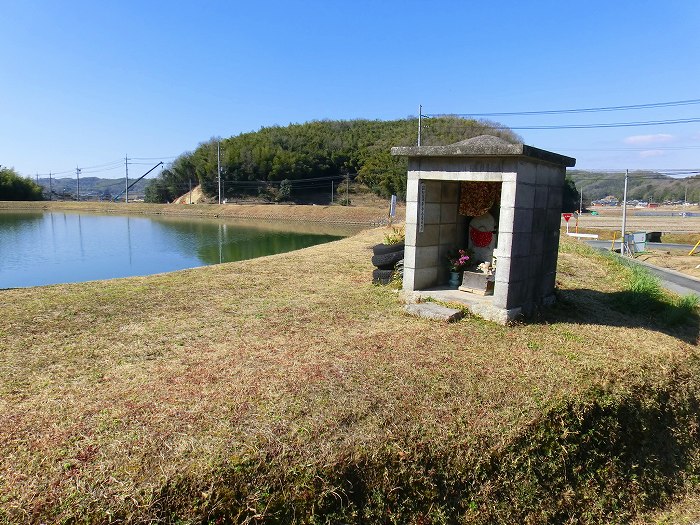 岡田池の旧県道側にある神護寺の道しるべと古い道標や牛塚。