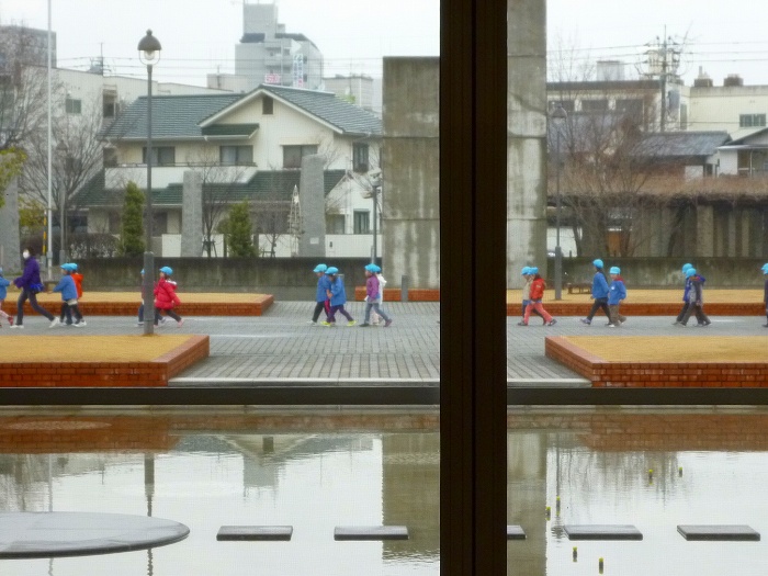 畳の間の正面は池、池の前を行く園児たち。
