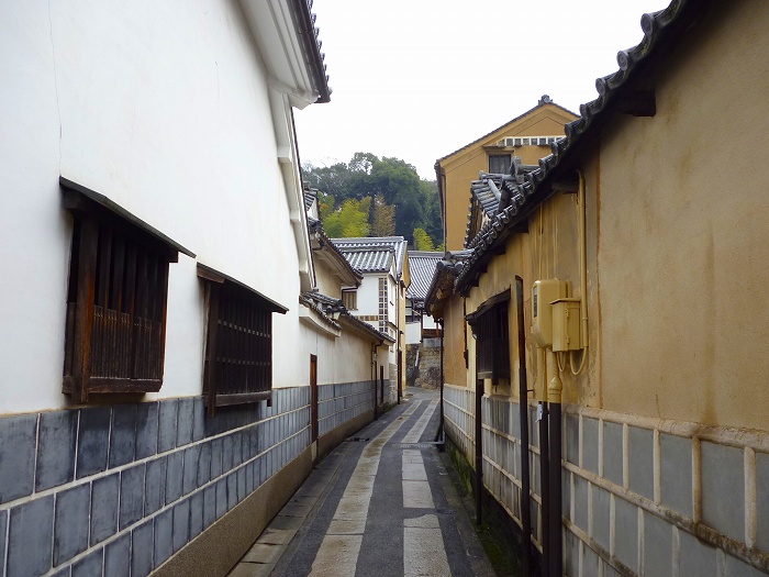 本町を横切り鶴形山に向かう。右の土壁は国指定の「井上家住宅」。