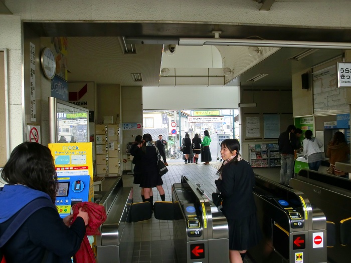 係り員が電車が停まるたびに改札口からで出る女子高校生に声を掛けている。
