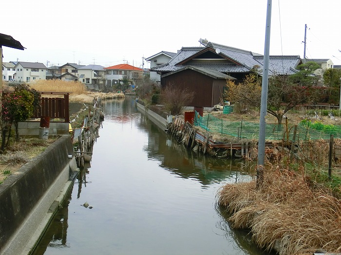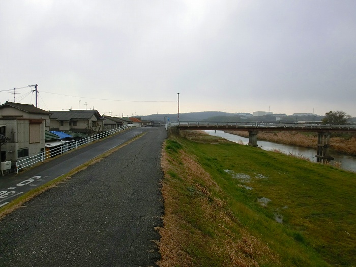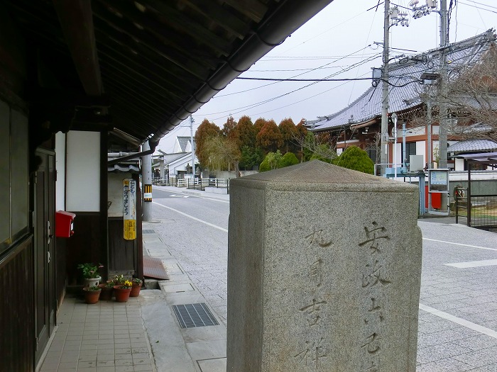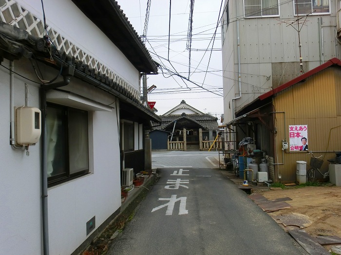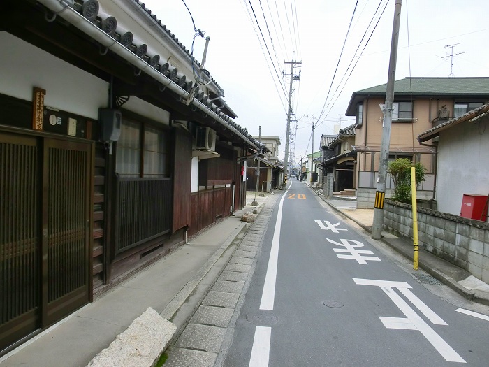商家の狭い道を抜けて旧庭瀬往来に出ると、