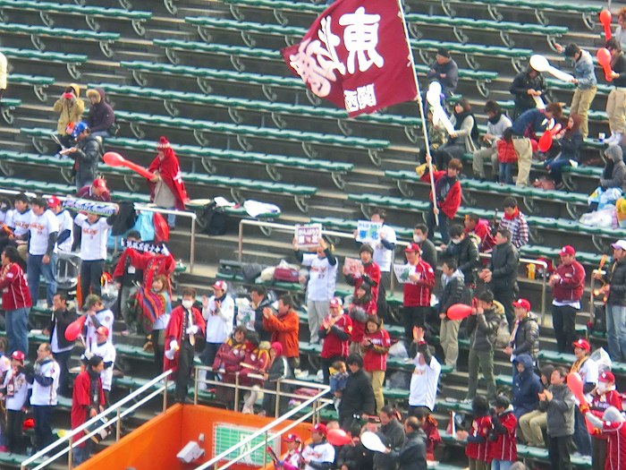 外野の楽天応援団では球団旗が揺れ、風船がふくらんだ。