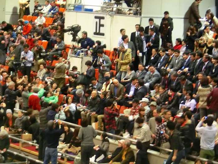 一国の首相がイス席で観戦いうのも面白い(写真↑、まんなか右に朝青龍。その右で下向きが首相)