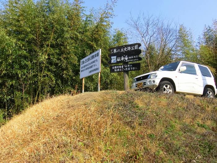 「庄新町」という住宅地の中に小山があり、そこが「王墓の丘史跡公園」。写真↑のように駐車場もある。