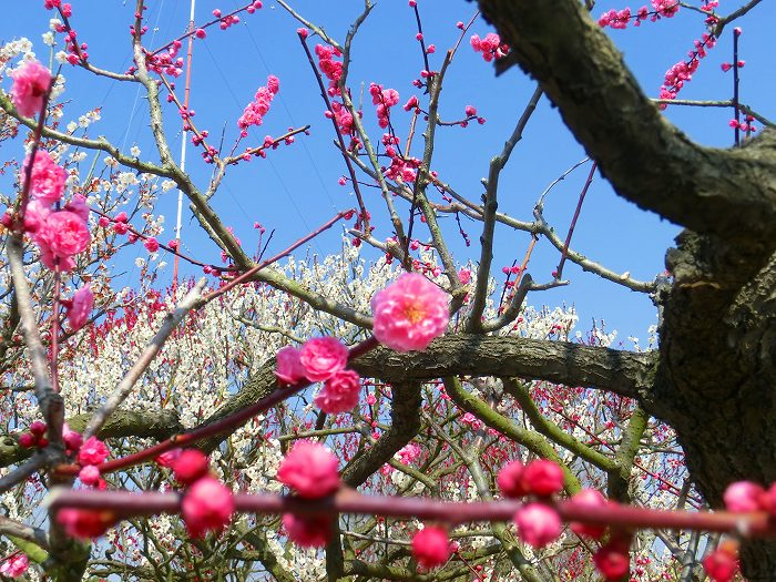 紅、白の梅と。青い空。
