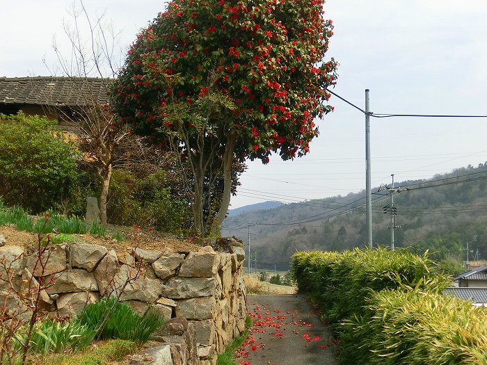 空に伸びる椿の花と、道に落ちる椿の花。